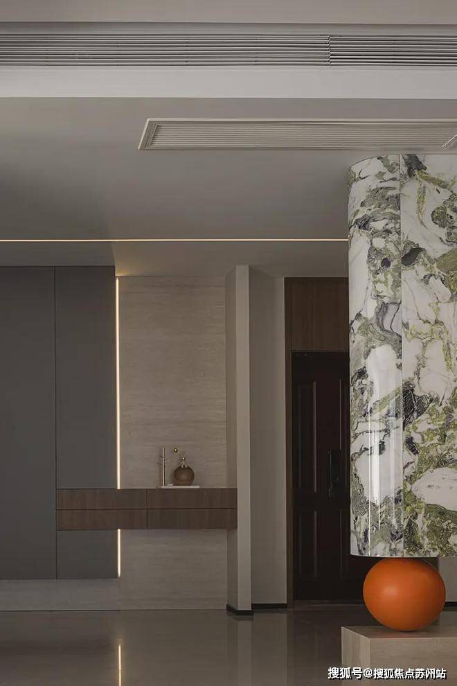 入户玄关,应用了翡翠绿岩板热弯工艺,低奢材质的选择,打造时尚优雅的宜居之境,使空间散发浪漫气息,成为空间的点睛之笔。