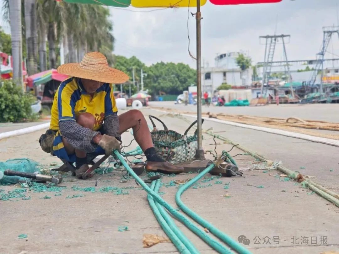 正午1时许,地角渔港西侧,满叔正戴着草帽坐在遮阳伞下,一手抓着钢索,一手握着东西,将数条拇指粗的钢索编绞在一同,并用纤维绳包裹固定。